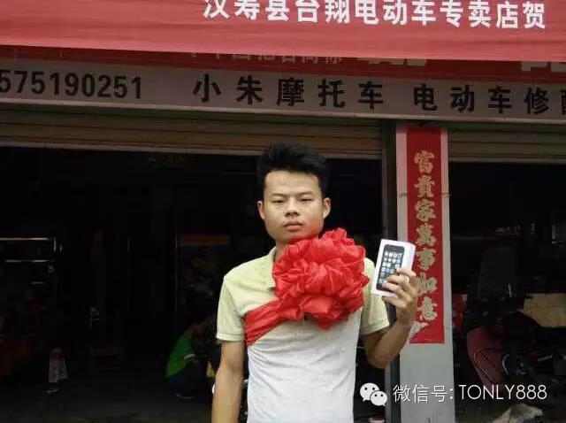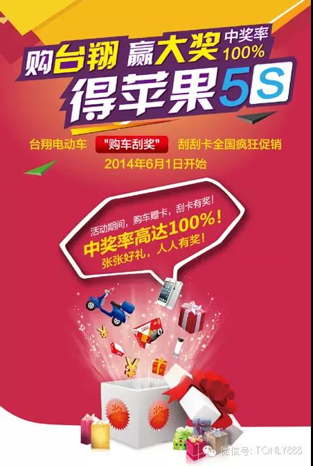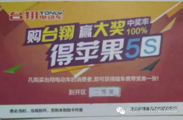 台翔电动车2014年6月1日开始的全国性活动“购台翔 赢大奖 得苹果5S”首个苹果5S已中出;
